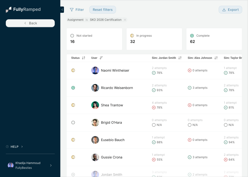 FullyRamped lets sales & enablement teams build interactive AI simulations of their real customer calls so sales reps can practice hyper-realistic scenarios on demand. Early on, the core practice loop worked. Reps could open the library, pick a simulation, and run a call. Good for self-directed reps. Useless for the part of the job enablement actually gets paid for, which is making sure the *right* people practice the *right* things.